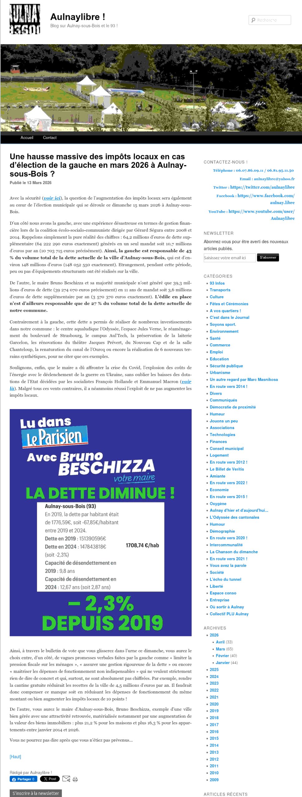 Le projet était forcément connu et maintenu secret durant la campagne électorale il y a à peine plus d'un mois. Ce même Stéphane Fleury, précédent et actuel adjoint aux finances de Bruno Beschizza accusait (sous faux nom) sur son blog AulnayLibre d'une possible "hausse massive des impôts locaux en cas d’élection de la gauche en mars 2026 à Aulnay-sous-Bois" (voir son article et la capture). Avec cet étonnant aplomb, sans signer son article bien que son numéro de téléphone personnel figure comme contact du blog, il dénonçait le choix "à travers le bulletin de vote que vous glisserez dans l’urne ce dimanche" des "vagues promesses verbales faites par la gauche comme « limiter la pression fiscale sur les ménages »". Concluait "Vous ne pourrez pas dire après que vous n'étiez pas prévenus...".