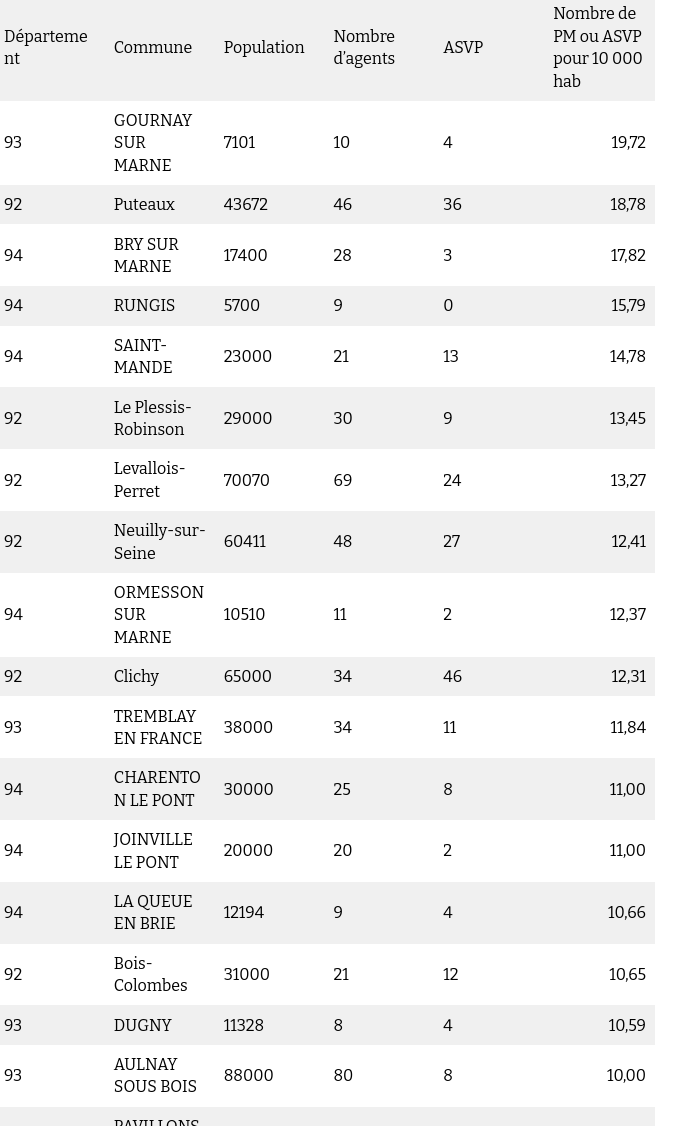À l’échelle francilienne, c’est en Seine-Saint-Denis que le nombre de policiers municipaux a le plus augmenté (+72%), avec 764 agents en 2024 contre 445 en 2014, suivi par le Val-d’Oise (+61%).(...)