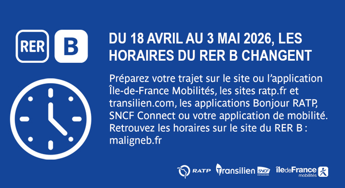 Du 18 avril au 3 mai 2026, les horaires changent. Préparez votre trajet sur le site ou l’app Île-de-France Mobilités, Bonjour RATP, SNCF Connect, votre app de mobilité, http://ratp.fr, http://transilien.com et http://maligneb.fr/horaires.